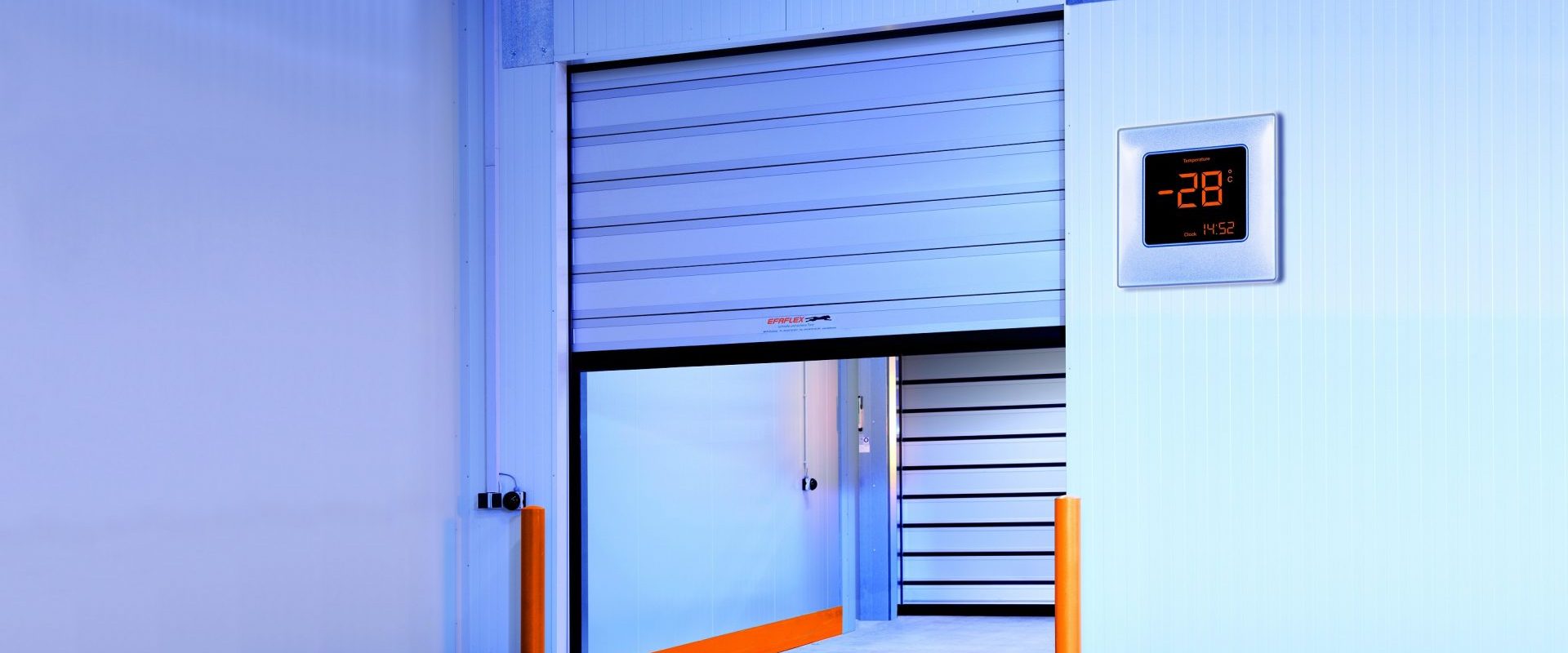 Las puertas de las zonas refrigeradas tienen que soportar cargas muy elevadas. La mejor calidad y un acabado perfecto son las condiciones para que todos los componentes resistan el frío y la humedad. Además, es imprescindible evitar los tiempos de inactividad de las puertas, ya que de lo contrario podría escaparse el frío y descongelarse la mercancía, lo que supondría un mayor consumo de energía. Las puertas de accionamiento rápido EFAFLEX para zonas de congelación