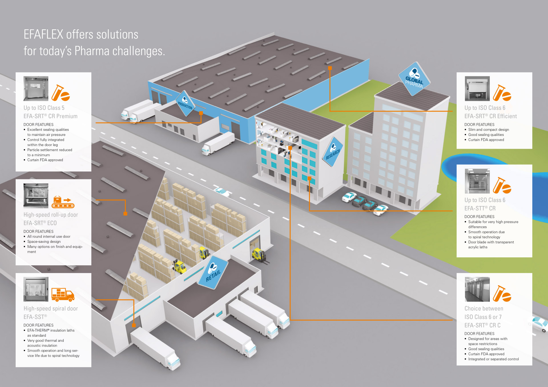 presión. Además, la estructura lisa de la superficie y el diseño sin bordes salientes de las puertas para salas blancas facilitan la limpieza y minimizan la acumulación de partículas. Por ello, las puertas industriales de EFAFLEX cumplen todos los requisitos necesarios para el sector farmacéutico, que se requieren en laboratorios o para la producción de medicamentos, tecnología médica o equipos de protección especiales.